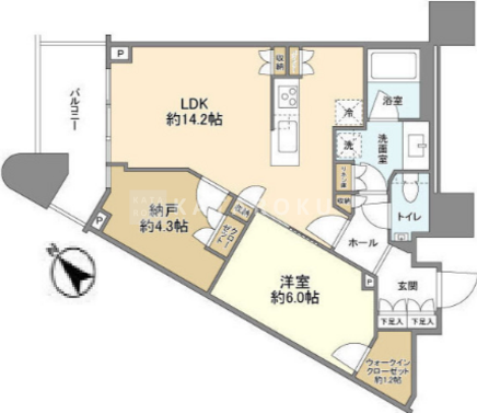| 平米数 | 57.12m2 | 部屋詳細 | LDK14.2帖/洋室6帖/サービスルーム4.3帖 |