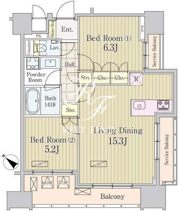 平米数 | 59.68m2 | 部屋詳細 | LDK15.3帖/洋室6.3帖/洋室5.2帖 |