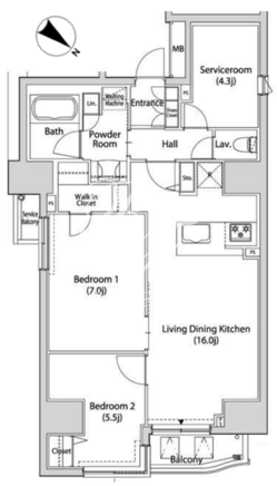 平米数 | 71.81m2 | 部屋詳細 | LDK16帖/洋室7帖/洋室5.5帖/サービスルーム4.3帖 |