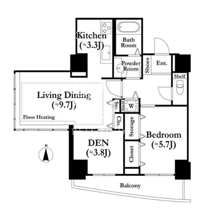 平米数 | 60.53m2 | 部屋詳細 | LDK13帖/洋室5.7帖/DEN3.8帖 |