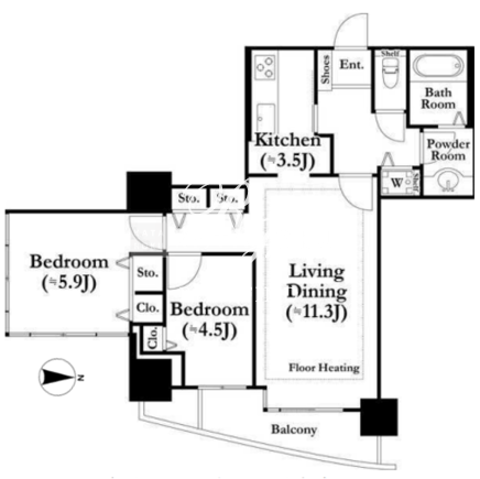 | 平米数 | 63.97m2 | 部屋詳細 | LDK14.8帖/洋室5.9帖/洋室4.5帖 |