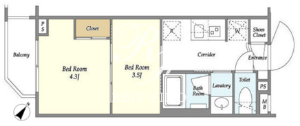 平米数 | 25.51m2 | 部屋詳細 | 洋室4.3帖/洋室3.5帖/K2帖 |
