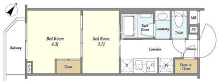 平米数 | 25.65m2 | 部屋詳細 | 洋室4.3帖/洋室3.7帖/K2帖 |