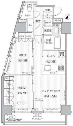 平米数 | 63.38m2 | 部屋詳細 | LDK14.3帖/洋室6.2帖/洋室5.7帖 |