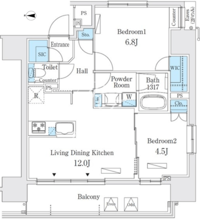 平米数 | 55.73m2 | 部屋詳細 | LDK12帖/洋室6.8帖/洋室4.5帖 |