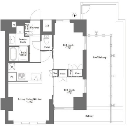 平米数 | 55.02m2 | 部屋詳細 | LDK13帖/洋室7.2帖/洋室4.5帖 |