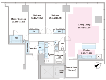 平米数 | 172.08m2 | 部屋詳細 | LDK43.1帖/洋室13.1帖/洋室10.8帖/洋室9.9帖/サービスルーム4.6帖 |