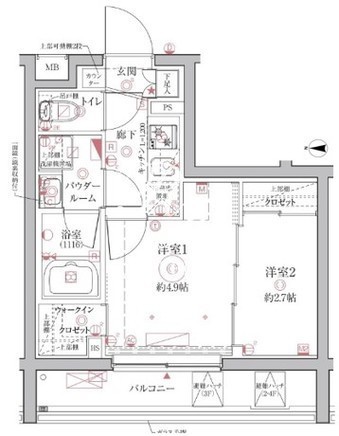 平米数 | 26.10m2 | 部屋詳細 | 洋室4.9帖/洋室2.7帖/K2帖 |
