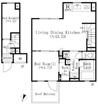 平米数 | 53.17m2 | 部屋詳細 | LDK13.3帖/洋室4.7帖/洋室3.3帖 |