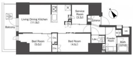 平米数 | 55.47m2 | 部屋詳細 | LDK11.9帖/洋室5帖/洋室4.8帖/サービスルーム3.3帖 |