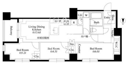 平米数 | 66.64m2 | 部屋詳細 | LDK13.6帖/洋室6帖/洋室5.2帖/洋室4.5帖 |