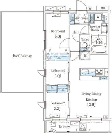 | 平米数 | 54.87m2 | 部屋詳細 | LDK12.6帖/洋室5帖/洋室3.3帖/洋室3帖 |