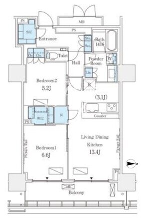 平米数 | 63.98m2 | 部屋詳細 | LDK13.4帖/洋室6.6帖/洋室5.2帖 |