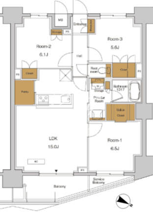 平米数 | 73.12m2 | 部屋詳細 | LDK15帖/洋室6.5帖/洋室6.1帖/洋室5.6帖 |
