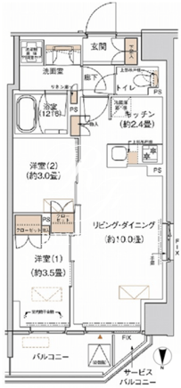 平米数 | 43.57m2 | 部屋詳細 | LDK12.4帖/洋室3.5帖/洋室3帖 |