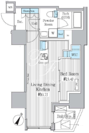 平米数 | 33.55m2 | 部屋詳細 | 洋室9.7帖/K3.4帖 |