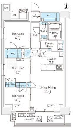 | 所在階/向き | 3階/南 | 間取り | 3LDK+WIC+SIC |