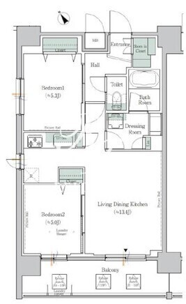平米数 | 54.88m2 | 部屋詳細 | LDK13.4帖/洋室5.3帖/洋室5帖 |