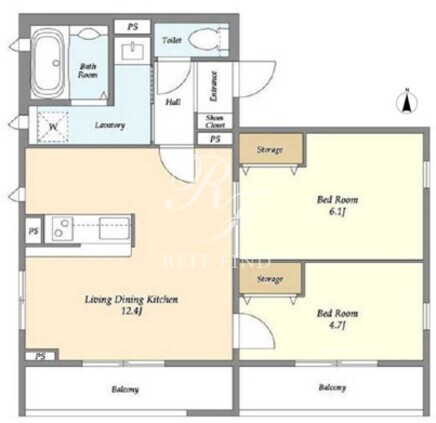 平米数 | 52.56m2 | 部屋詳細 | LDK12.4帖/洋室6.1帖/洋室4.7帖 |