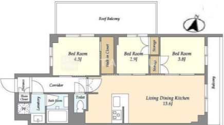 | 平米数 | 55.66m2 | 部屋詳細 | LDK13.6帖/洋室4.3帖/洋室3.8帖/洋室2.9帖 |