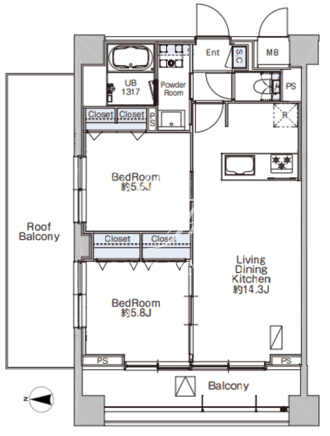 平米数 | 56.99m2 | 部屋詳細 | LDK14.3帖/洋室5.8帖/洋室5.5帖 |