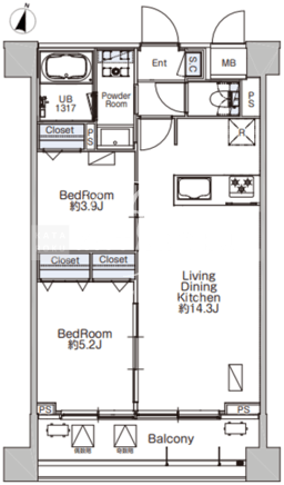 平米数 | 51.15m2 | 部屋詳細 | LDK14.3帖/洋室5.2帖/洋室3.9帖 |