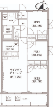 | 平米数 | 65.43m2 | 部屋詳細 | LDK14.2帖/洋室6.2帖/洋室5.3帖/洋室4.5帖 |