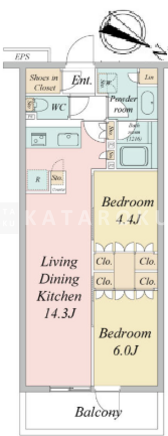 | 平米数 | 52.72m2 | 部屋詳細 | LDK14.3帖/洋室6帖/洋室4.4帖 |