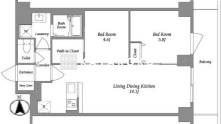 | 平米数 | 55.79m2 | 部屋詳細 | LDK14.1帖/洋室5.8帖/洋室4.6帖 |