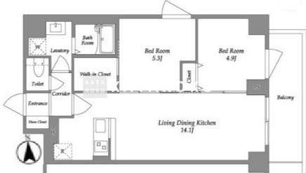 | 平米数 | 55.79m2 | 部屋詳細 | LDK14.1帖/洋室5.3帖/洋室4.9帖 |