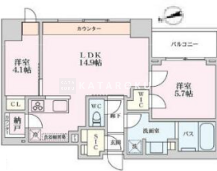 | 平米数 | 57.45m2 | 部屋詳細 | LDK14.9帖/洋室5.7帖/洋室4.1帖 |