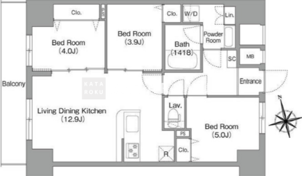 | 平米数 | 59.91m2 | 部屋詳細 | LDK12.9帖/洋室5帖/洋室4帖/洋室3.9帖 |