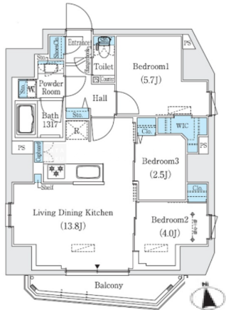 | 平米数 | 59.35m2 | 部屋詳細 | LDK13.8帖/洋室5.7帖/洋室4帖/洋室2.5帖 |